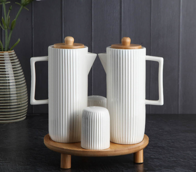 Inhoud:2 x Olie- / Azijn Fles1 x Zoutvaatje1 x Pepervaatje1 x Bamboe stand