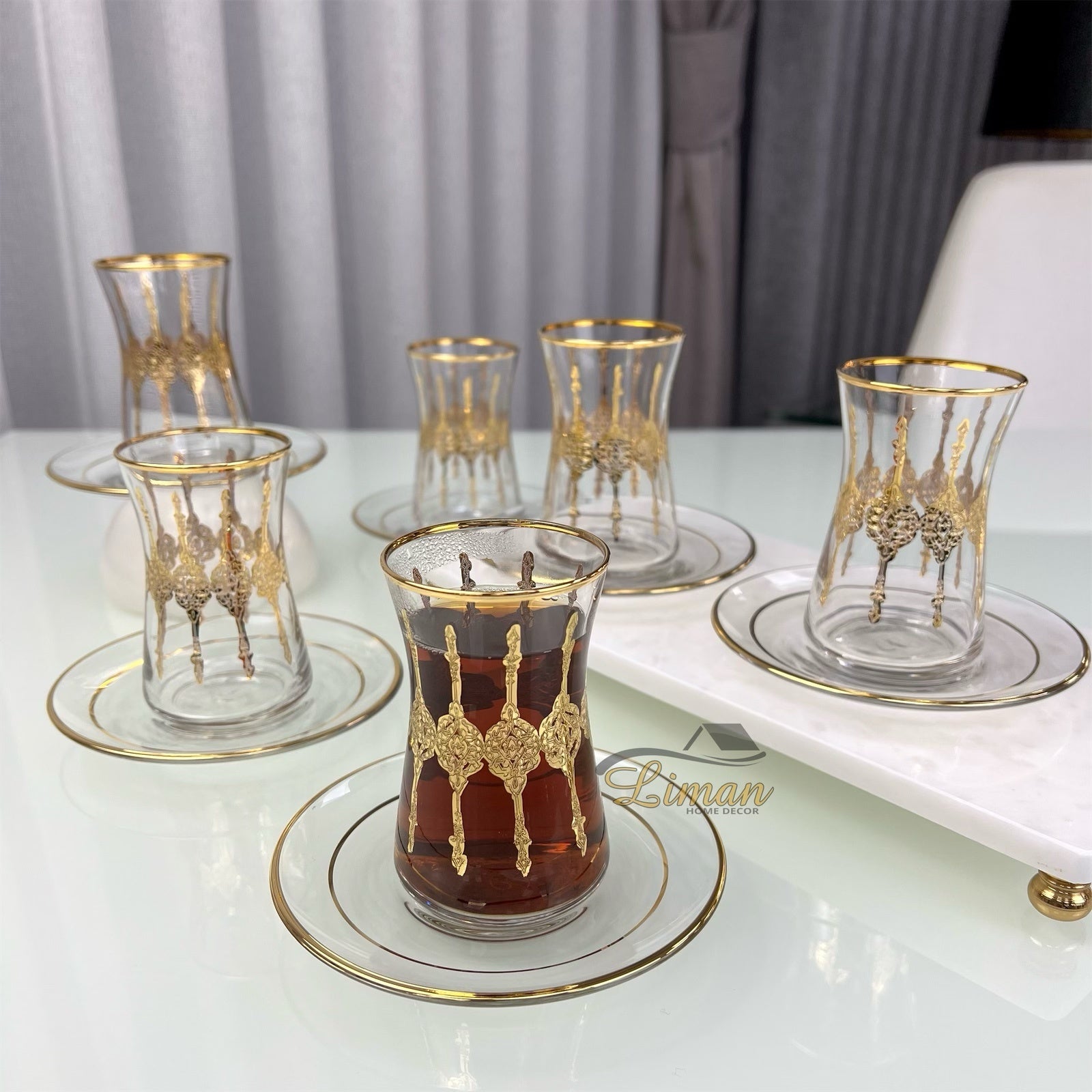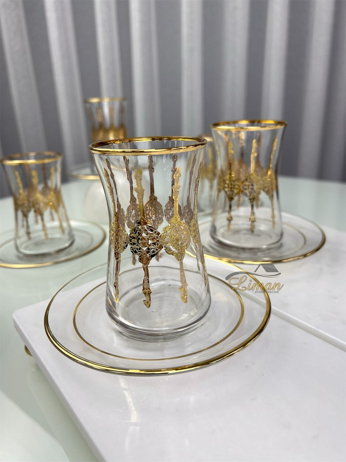 6 Teegläser mit goldenem Rand6 Unterteller Handwäsche empfohlen