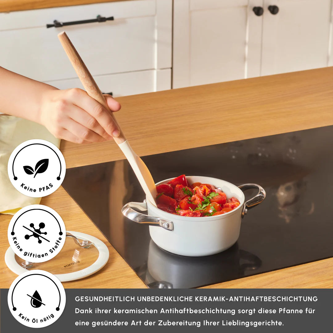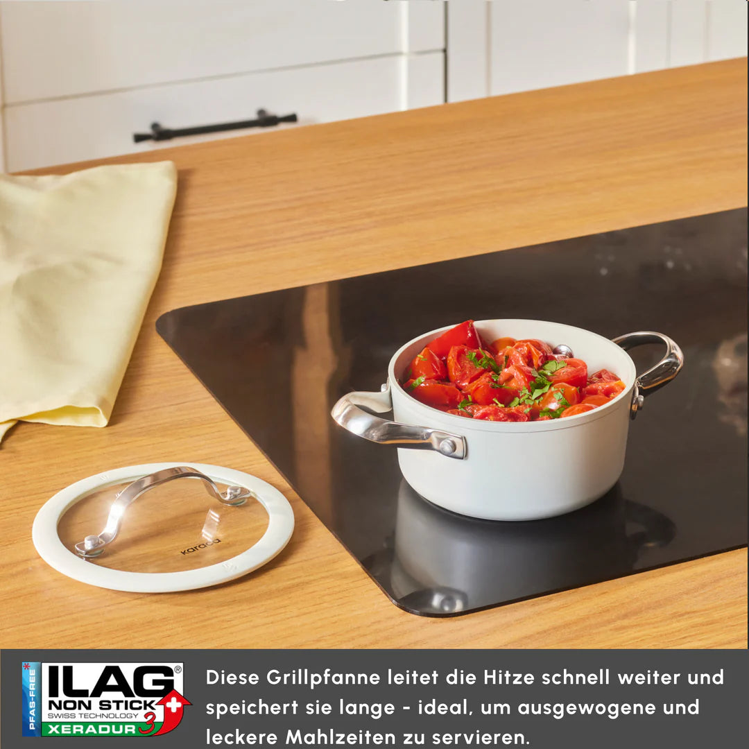 Ein brandneues Pfannenset mit hervorragenden Antihafteigenschaften: SwissCrystal Das Karaca SwissCrystal Pfannenset, das seine Stärke aus der antihaftbeschichteten SwissCrystal Oberfläche bezieht, bietet Ihnen die Möglichkeit, eine Reihe von Gerichten auf praktische Weise zuzubereiten, wie z.B. Eier, Fisch, Hähnchen, und das ganz ohne Öl. Die antihaftbeschichtete Oberfläche wird mit Schweizer Kristallen hergestellt und enthält keine gesundheitsgefährdenden chemischen Verbindungen wie „PFAS“, die die Gesundheit beeinträchtigen. Zudem ist das SwissCrystal Pfannenset leicht zu reinigen! Egal, welches Gericht Sie zubereitet haben, es genügt, es kurz unter Wasser zu halten. Die essentiellen und praktischen Eigenschaften des SwissCrystal Pfannensets erleichtern Ihnen die Zubereitung schmackhafter Gerichte und sorgen für eine einfache Handhabung in Ihrer Küche.