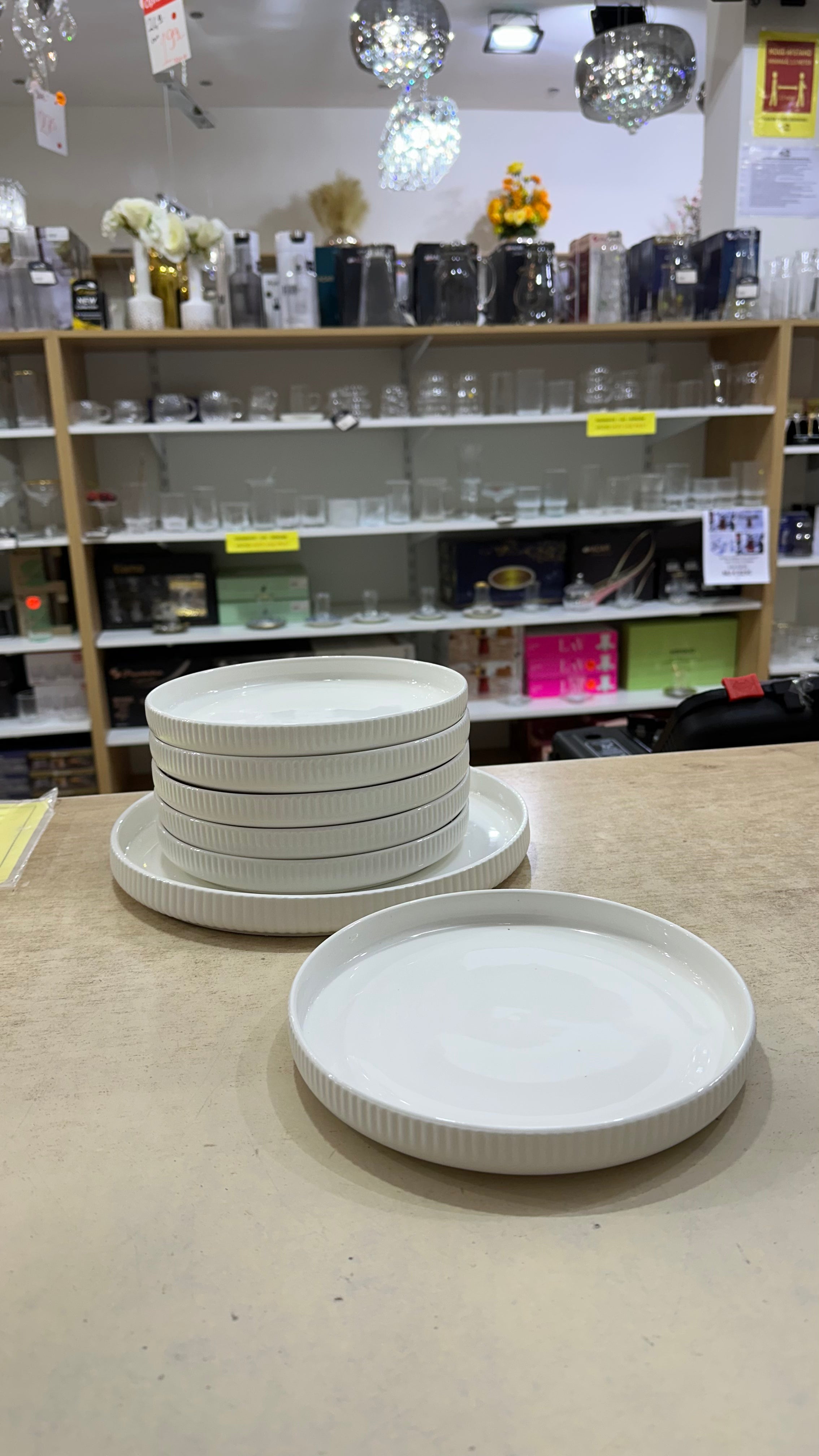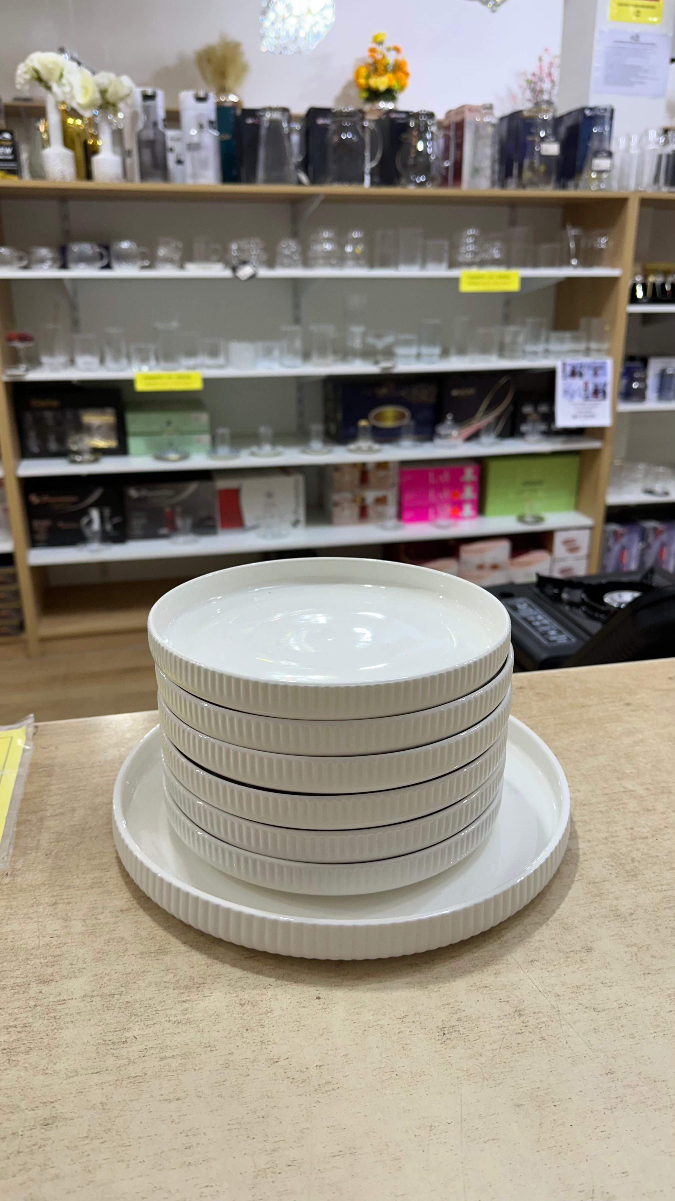 Das Set besteht aus 6 Desserttellern und 1 passender Servierplatte. Die frische weiße Farbe und der zeitlose Stil passen mühelos zu jedem Tischarrangement und Geschirrset.