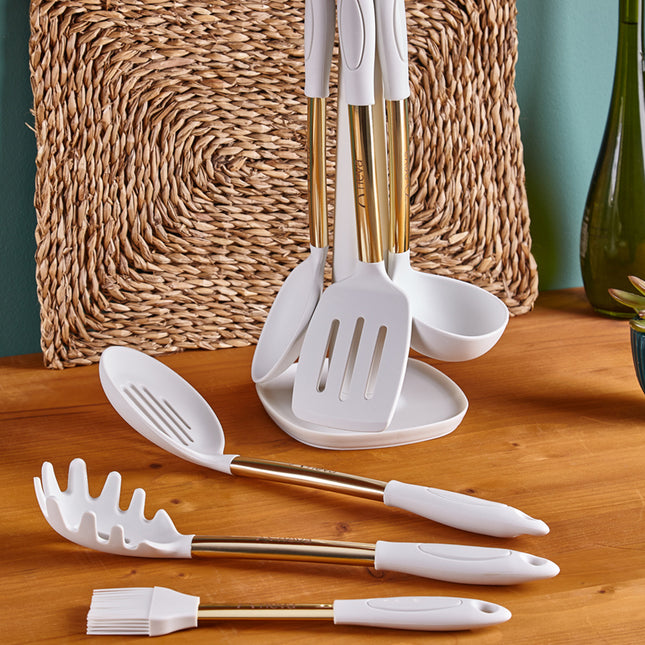 Afmeting:1 stuk pasta schep 34 cm1 Serveerlepel 34 cm1 x sleufschep 34,5 cm1 x spatel 34,5 cm1 x Soeplepel 32 cm1 x  Siliconen kwast 25cm1 x standaard 40 cm Waarschuwing: het wordt niet aanbevolen om in de vaatwasser te wassen,...