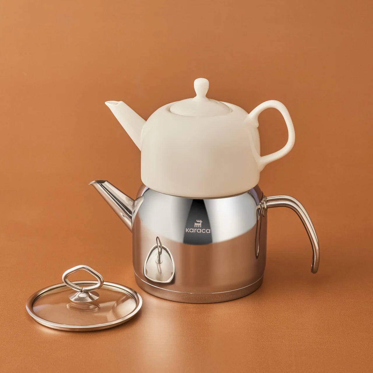 ✨ Savourez une tasse de thé parfaite avec la théière Karaca Pocelinox – avec un joli pot en porcelaine en haut et un pot solide en acier inoxydable en bas, idéal pour tous les moments thé! ✨