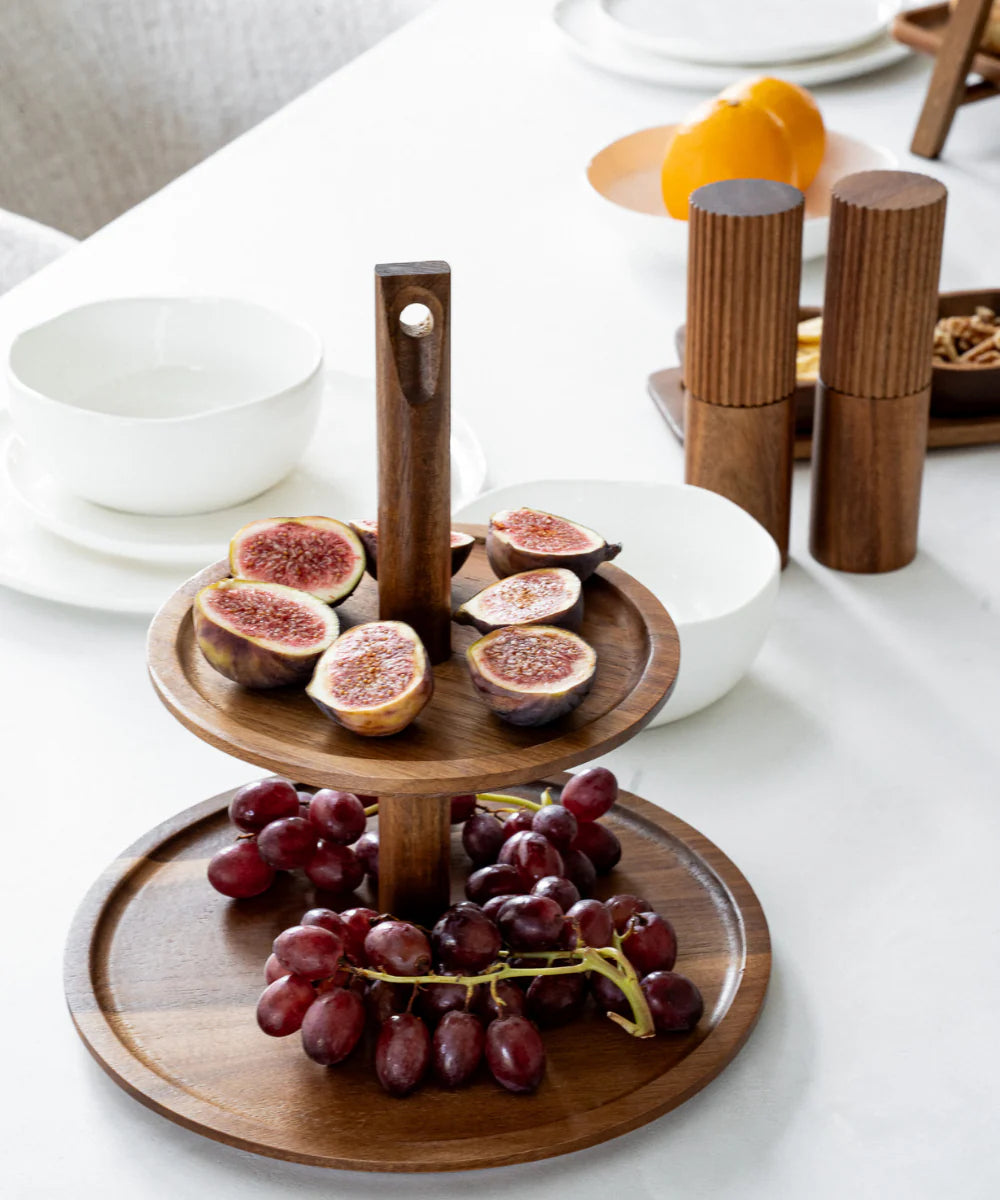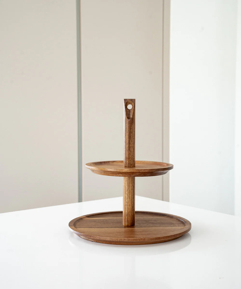 De acacia Lumo-etagère combineert een minimalistisch design met de natuurlijke warmte van acaciahout. Ideaal voor gebak, fruit of kleine hapjes...