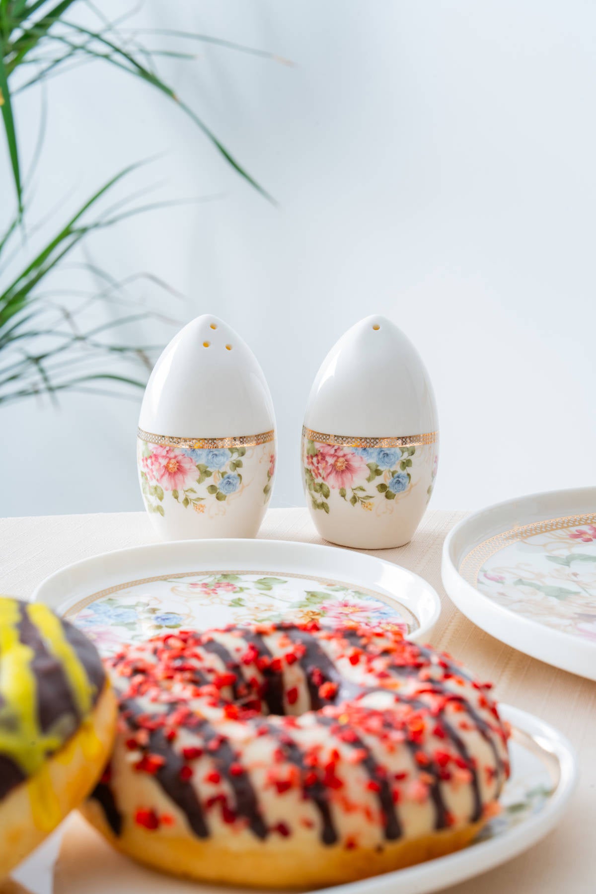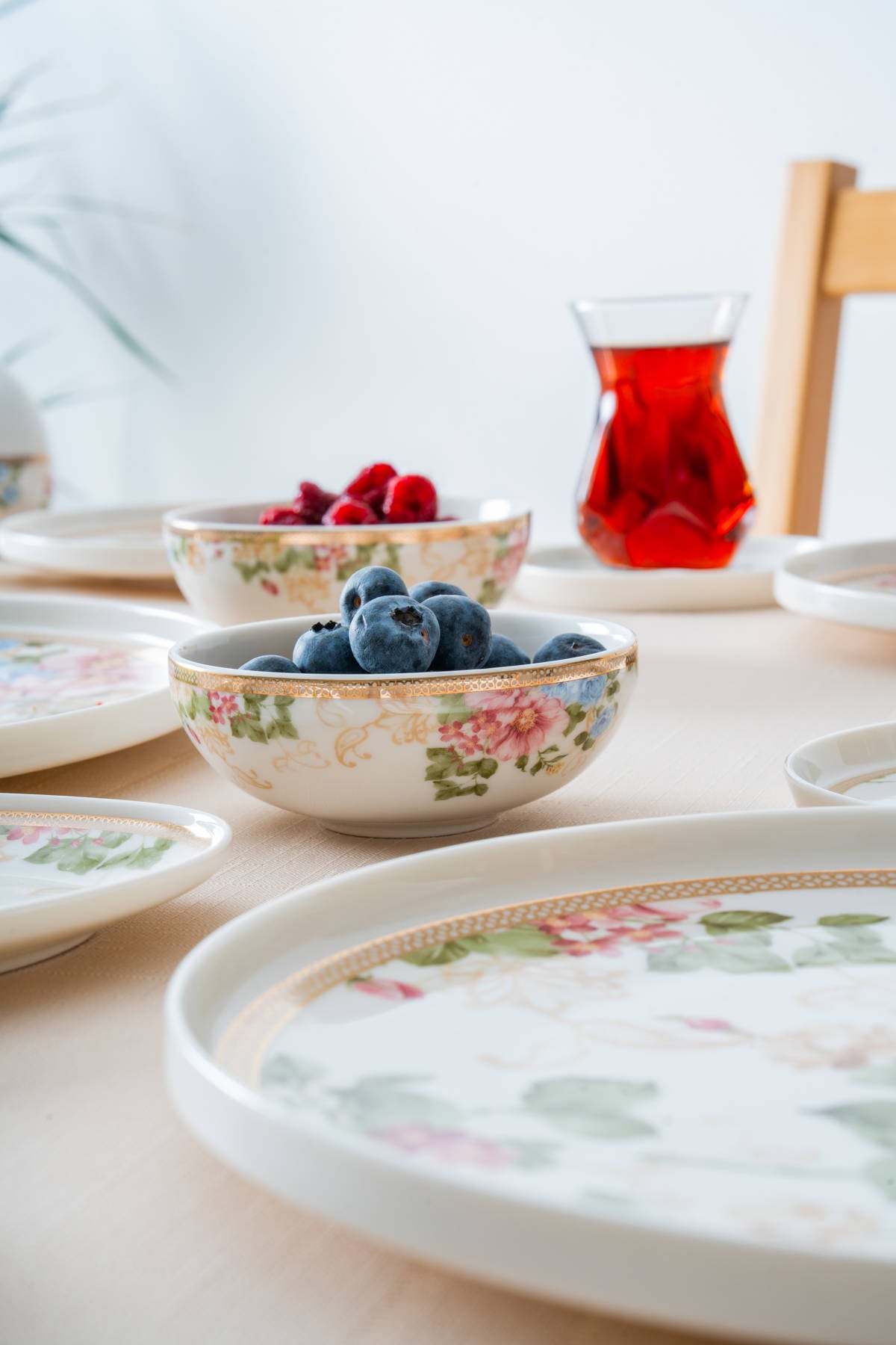 Inhoud: 1 serveerschaal: 27cm 6 dessertborden: 20,5cm 6 schoteltjes 4 jamkommetjes 4 ovale schalen: 22 x 12 x 1,5 cm...