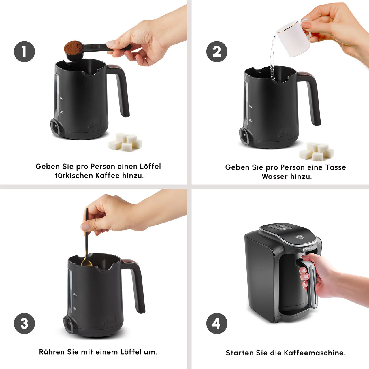 Met de Karaca Hatır Neo Turkse koffiemachine geniet je van traditionele Turkse koffie, koffie met houtskoolaroma (Közde Türk Kahvesi) en gearomatiseerde Turkse koffie – allemaal met één druk op de knop. Je kunt in één keer tot 5 kopjes koffie bereiden, waarbij de machine automatisch de ideale zettemperatuur instelt voor de beste smaak en een rijke schuimlaag. Dankzij de speciale maatschep en het geluid- en lichtsignaal weet je precies wanneer je koffie klaar is, zonder dat je erbij hoeft te blijven.