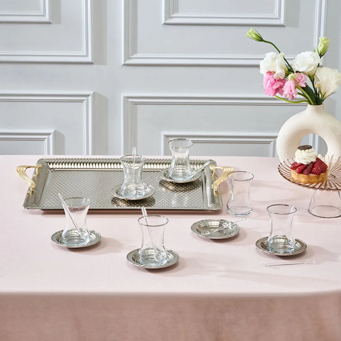 Inhoud: 6 x theeglas 6 x theeschotel 6 x theelepel 1 x dienblad