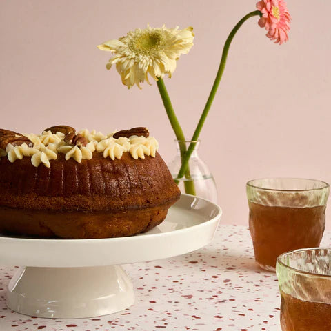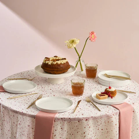 Set-inhoud: 1 taartplateau met voet (26 cm) 6 dessert- / bijgerechtenborden (21 cm) Materiaal: Bone China Onderhoud: handwas aanbevolen