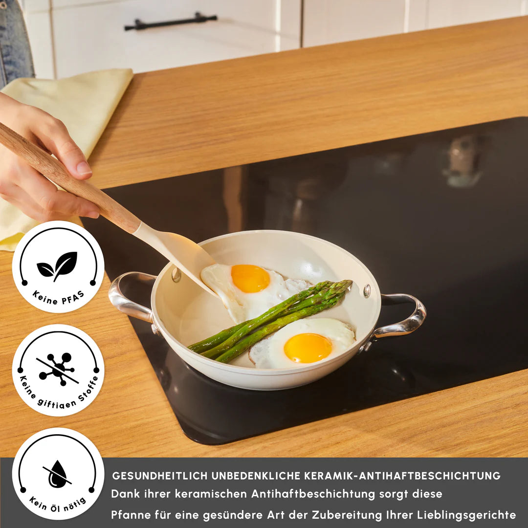 Met de Karaca SwissCrystal koekenpanset, voorzien van een antiaanbaklaag van SwissCrystal, kunt u op een praktische manier allerlei gerechten bereiden, zoals eieren, vis en kip, zonder olie te gebruiken. De antiaanbaklaag is gemaakt van Zwitserse kristallen en bevat geen schadelijke chemicaliën zoals PFAS, waarvan bekend is dat ze de gezondheid kunnen schaden.