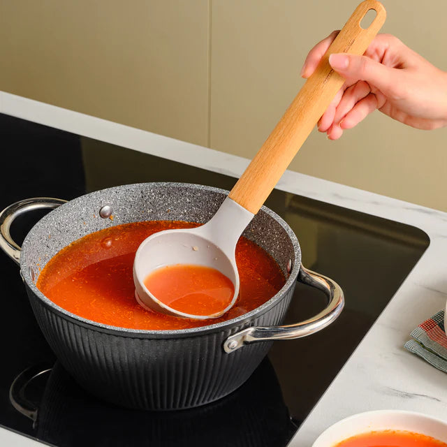 Elk item is gemaakt met een hittebestendige siliconen kop en een natuurlijk beukenhouten handvat, zodat je potten, pannen en werkoppervlakken beschermd blijven tegen krassen. Tegelijkertijd zorgen de materialen voor comfort en een stijlvolle kookervaring.