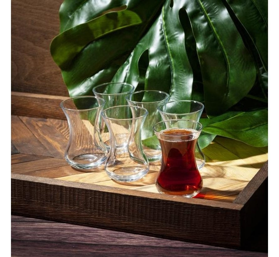 Deze designset van Pasabahce bestaande uit 6 Turkse theeglazen en is perfect voor iedere liefhebber van Turkse thee. Pasabahce is internationaal bekend om haar glaswerk, met name de Turkse theeglazen, en staat voor een goede kwaliteit.