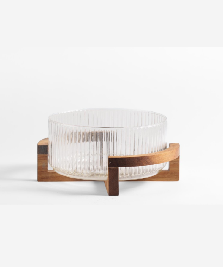 Breng stijl en functionaliteit samen met onze verfijnde glazen serveerschalen op rustieke houten standaards – ideaal voor een moderne en...