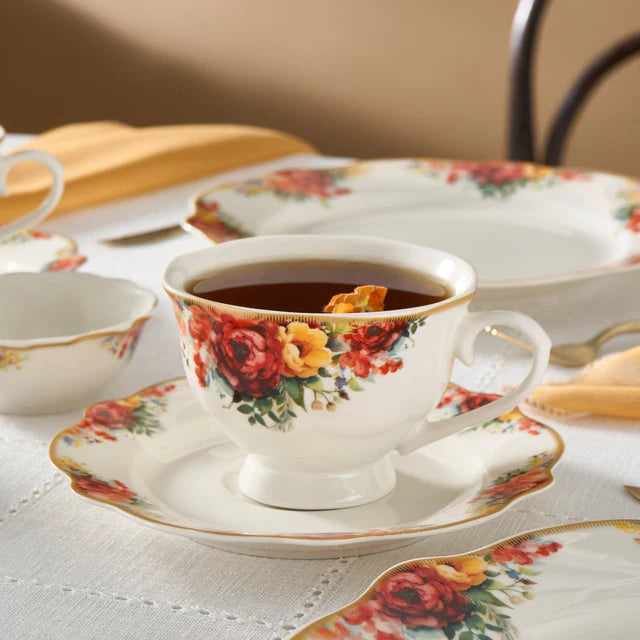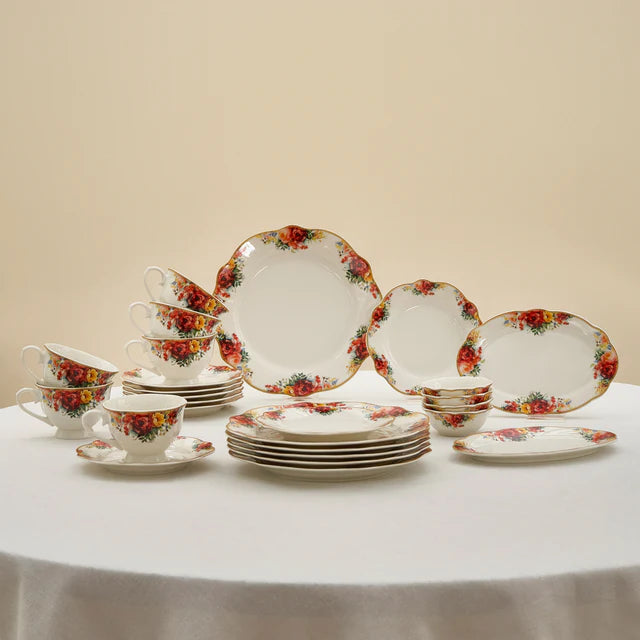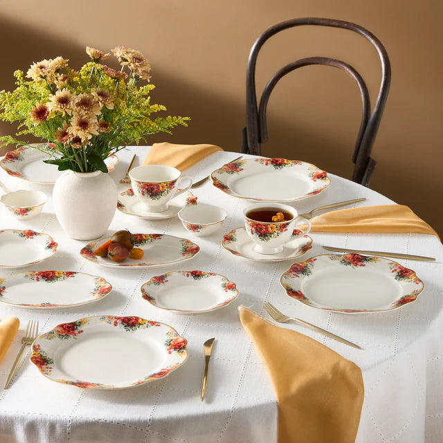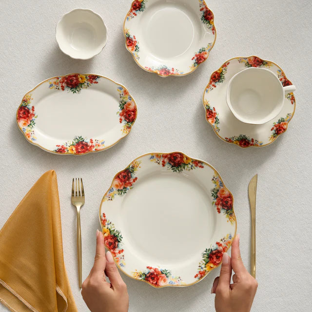 İçerik:6 x kahvaltı tabağı6 x fincan6 x tabak4 x reçellik2 x küçük servis tabağı2 x yuvarlak peynir tabağı